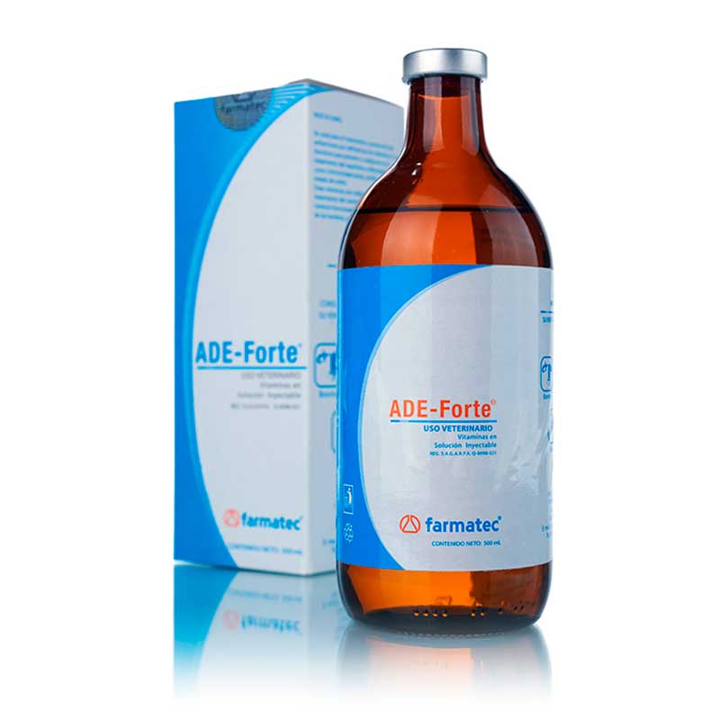 ADE-Forte 500 ml es un suplemento vitamínico A-D-E emulsificable de Farmatec para bovinos, formulado para el tratamiento y prevención de avitaminosis por deficiencias de A, D y E, con acción rápida y prolongada.