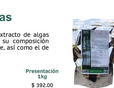 Fertilizante orgánico formulado a partir de un extracto de algas marinas del género Ascophyllum Nodosum, por su composición estimula el crecimiento de la raíz, del tallo y follaje, así como el de las flores y los frutos.