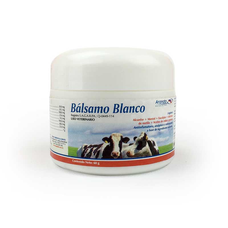 Bálsamo Blanco 60 g es una pomada antiinflamatoria y rubefaciente de Laboratorio Aranda, formulada con alcanfor, mentol y salicilato de metilo para uso en todas las especies. Su uso principal es como coadyuvante en el tratamiento de inflamaciones y lesiones.