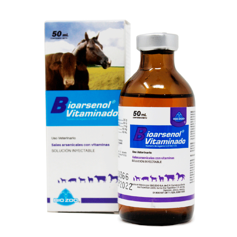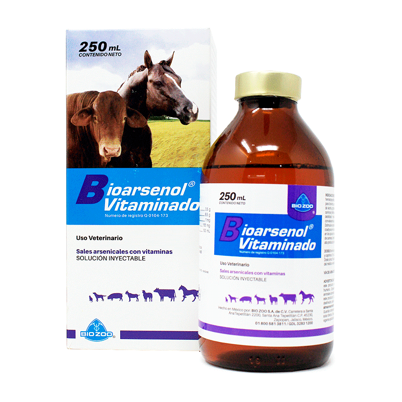 Bioarsenol® Vitaminado es un tónico hematopoyético y reconstituyente arsenical vitaminado para bovinos, ovinos y caprinos de engorda y producción de leche, porcinos de engorda y reproductoras, equinos, caninos y felinos. Indicado en casos de anemia, raquitismo, debilidad muscular, agotamiento por hemorragias y convalecencias, enfermedades infecciosas o parasitarias. Útil en animales en los que se requiere gran esfuerzo como en los caballos de carreras, hembras con numerosas crías, y en ganado de alta producción lechera.