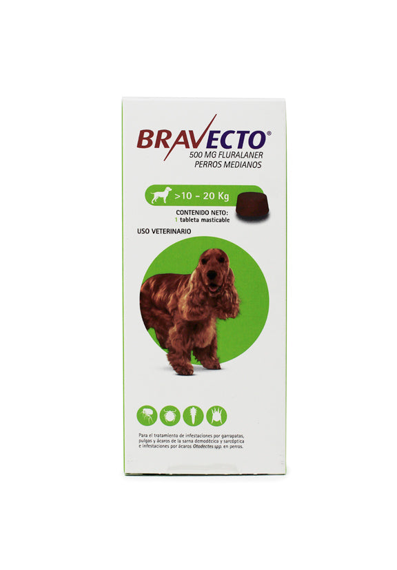 1 tableta masticable por vía oral, cada 12 semanas según el peso. Método de administración: No se deben romper o dividir los comprimidos masticables. Administre en el momento de la alimentación o cerca del horario de la misma. Bravecto es un comprimido masticable muy aceptado por los perros. Si el perro no ingiere el comprimido de forma voluntaria puede administrarse con el alimento o directamente en la boca. Se deberá observar el perro durante la administración para comprobar que haya ingerido el comprimido. Esquema de tratamiento: Para un control óptimo de pulgas y garrapatas se debe administrar el producto a intervalos de 12 semanas. Bravecto puede administrarse durante todo el año.