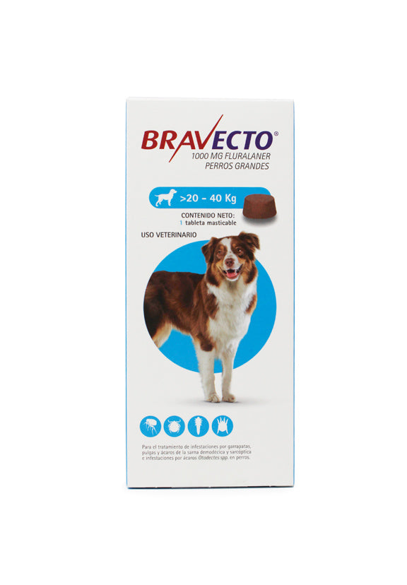 No utilizar en cachorros menores a 8 semanas de edad y/o perros que pesen menos de 2 kg. No administrar a intervalos menores a 8 semanas ya que no se evaluó la seguridad en tales circunstancias. Administración durante la preñez y la lactancia: El producto puede ser utilizado en perras preñadas y en lactancia. Interacciones medicamentosas: Ninguna conocida. Durante los estudios clínicos realizados, no se observaron interacciones entre Bravecto y ninguno de los medicamentos de uso habitual. Seguridad: Se demostró la seguridad del producto en perras preñadas y en lactancia tratadas con una sobredosis de hasta 3 veces la dosis máxima recomendada. Se demostró la seguridad del producto en cachorros de 8-9 semanas de edad y 2 – 3,6 kg de peso tratados con una sobredosis de hasta 5 veces la dosis máxima recomendada en 3 ocasiones a intervalos menores (8 semanas) que el indicado. El producto fue bien tolerado en perros Collies con deficiencia de la proteína de resistencia a múltiples drogas 1 (MDR1 – / -) luego de una administración única de 3 veces la dosis indicada. Consulte al médico veterinario.