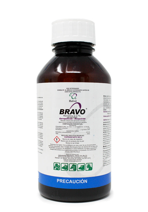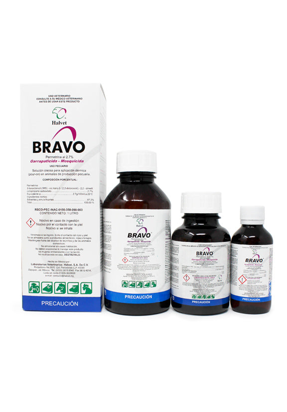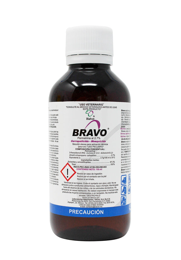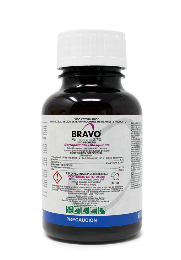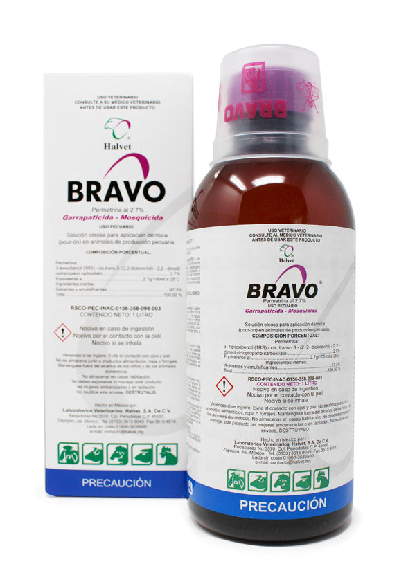 Bravo® Permetrina 2.7% Pour On es un garrapaticida y mosquicida de aplicación dérmica formulado con permetrina al 2.7%, desarrollado por el laboratorio Halvet para uso en bovinos. Es una solución oleosa pour on de uso externo exclusivo para el control de ectoparásitos en animales de producción pecuaria.