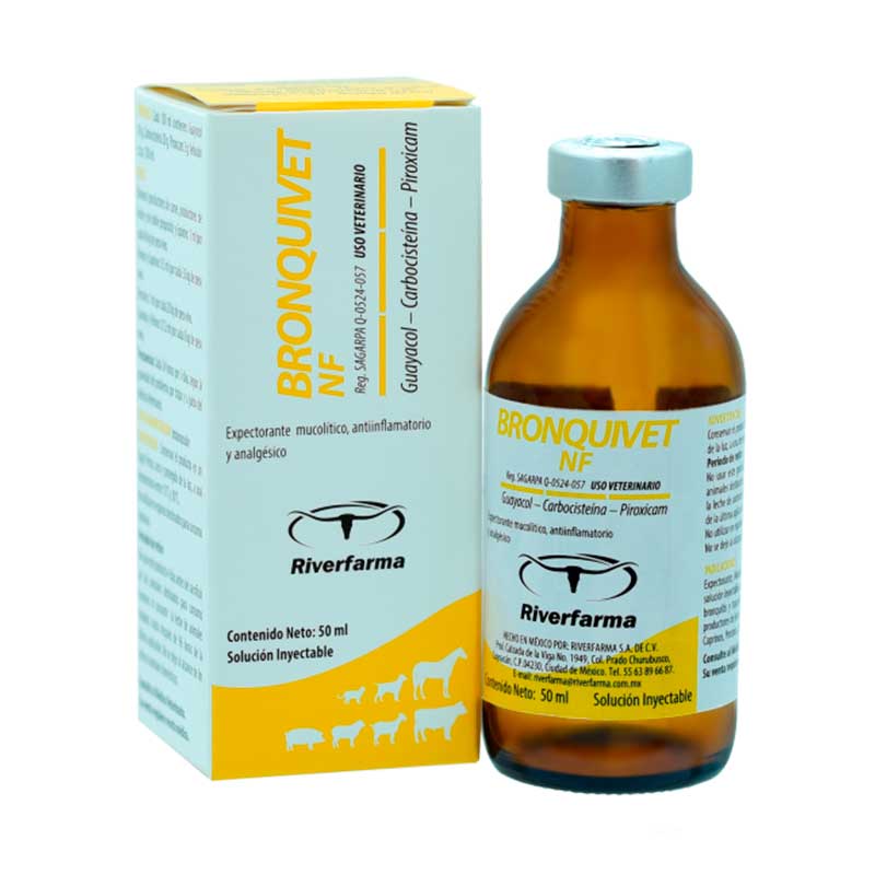 Bronquivet NF 50 ml es un expectorante, mucolítico, antiinflamatorio y analgésico inyectable de Riverfarma, formulado con Guayacol, Carbocisteína y Piroxicam, indicado para el tratamiento de afecciones respiratorias en bovinos.