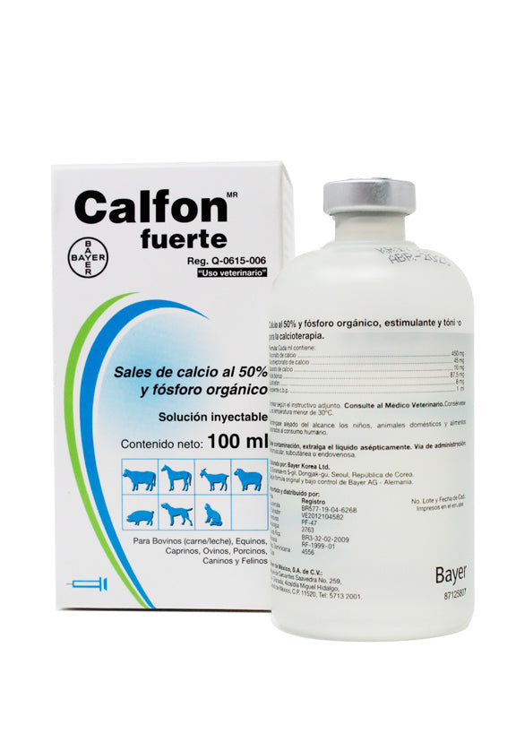 Calfon® Fuerte es un suplemento mineral veterinario de Bayer para bovinos, formulado con sales de calcio y fósforo orgánico, indicado principalmente para el tratamiento de afecciones por deficiencia de calcio como la paresia hipocalcémica (fiebre de leche).
