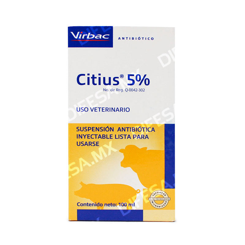 Citius 5% es un antibiótico de amplio espectro de Virbac, cuyo principio activo es Ceftiofur (clorhidrato) 50 mg/ml. Está indicado para uso en bovinos adultos para el tratamiento de enfermedades respiratorias, pododermatitis, mastitis y metritis causadas por microorganismos sensibles.