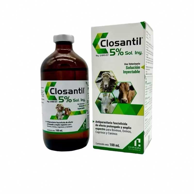 Closantil Inyectable 5% 100 ml, con closantel como principio activo, es un antiparasitario interno (endectocida) de laboratorio Chinoin Veterinaria, formulado para el tratamiento de parásitos internos en bovinos.