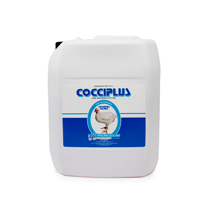 COCCIPLUS, es un coccidicida líquido para el agua de bebida formulado a base de robenidina, sulfaguanidina y etopabato, para el tratamiento contra la coccidiosis clínica o subclinica (coccidiasis) ocasionada por Eimeria acervulina, E. brunetti, E. máxima, E, mivati, E. necatrix y E. tenella en pollo de engorda y pollita de reemplazo hasta las 16 semanas de edad.