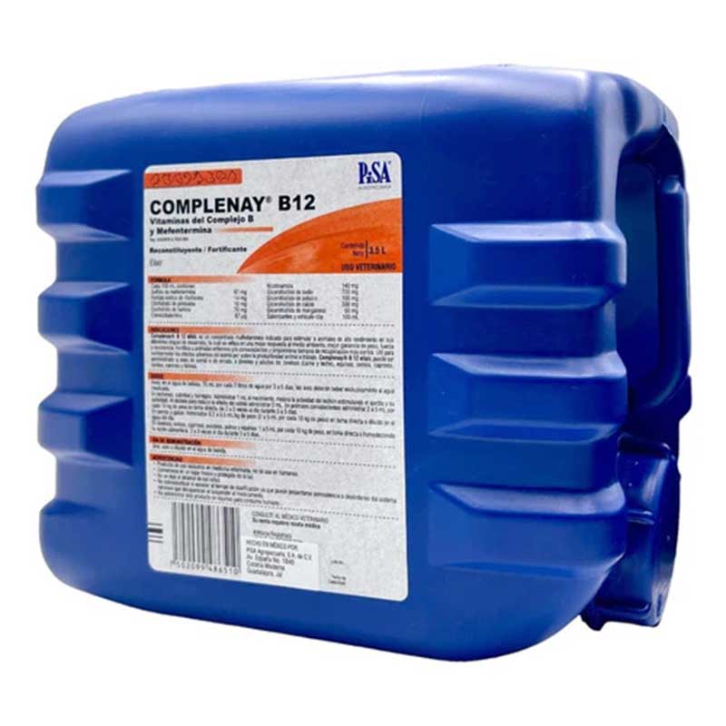 Complenay B12 3.5 Litros es un complejo vitamínico con vitamina B12 de PiSA Agropecuaria, formulado para bovinos. Su uso principal es como suplemento vitamínico para apoyar el metabolismo y la salud general del ganado.