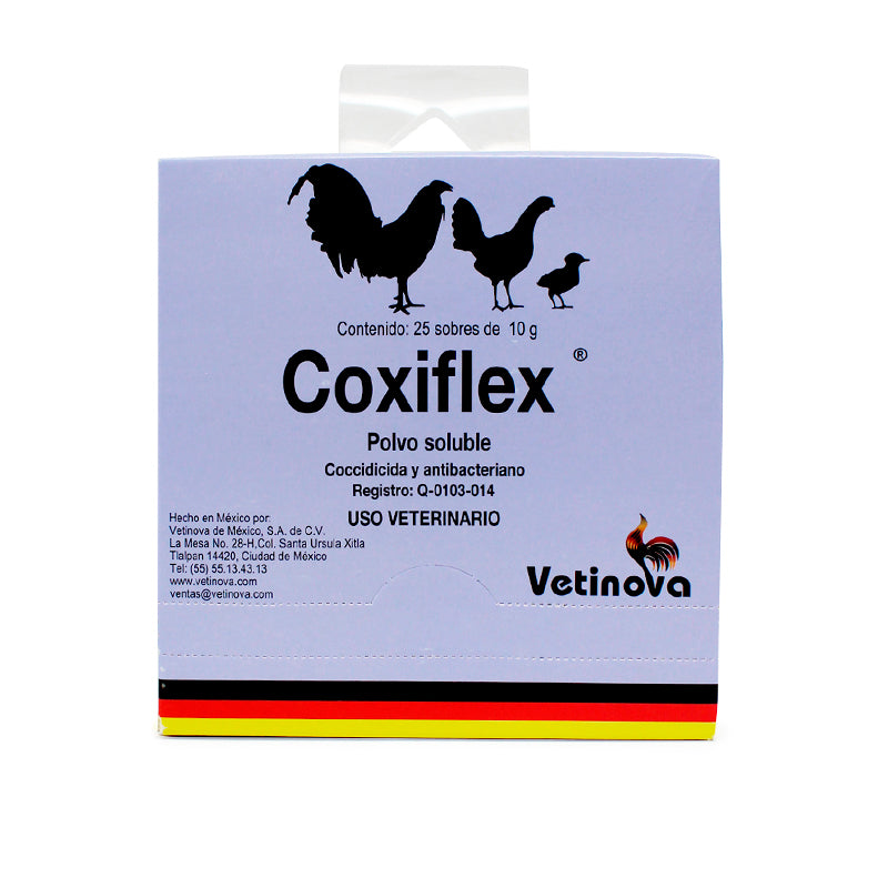 Coxiflex® Polvo es un producto veterinario de Vetinova que contiene Sulfadimetoxina y Trimetoprim. Está indicado para aves de combate de todas las edades, como tratamiento para la coccidiosis, salmonelosis, coriza y cólera aviar.
