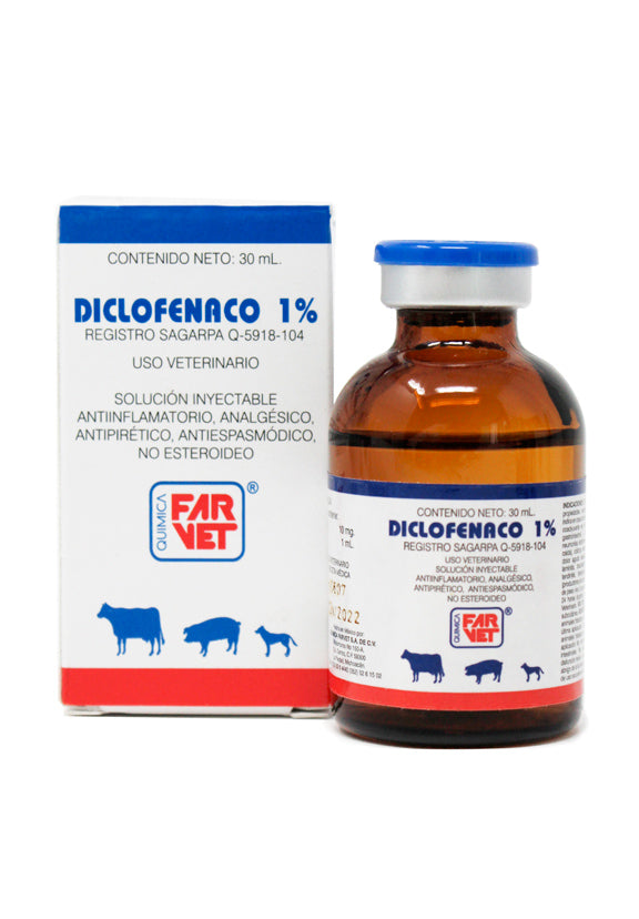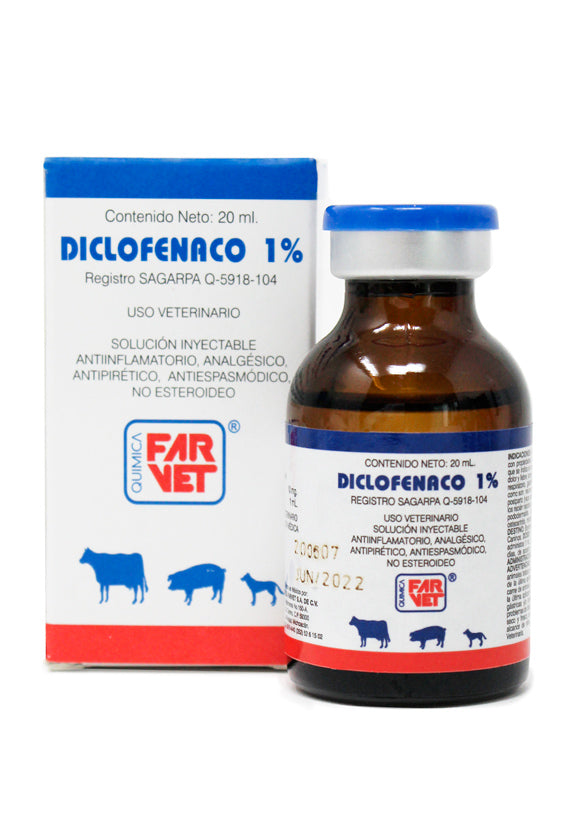 Diclofenaco 1% es un antiinflamatorio no esteroide (AINE) de Quimica Farvet, cuyo principio activo es Diclofenaco sódico. Está indicado para todas las especies, principalmente bovinos, porcinos y caninos, para el tratamiento de procesos inflamatorios, dolor y fiebre.