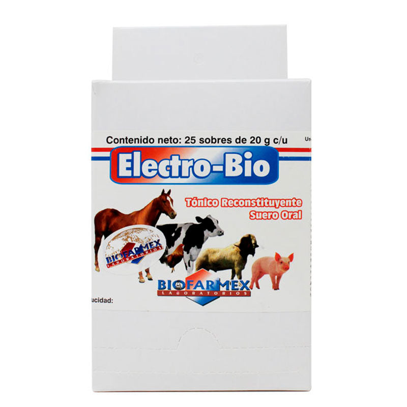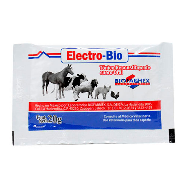 Electro-Bio de Biofarmex es un tónico reconstituyente y suero oral en polvo para todas las especies, indicado para la corrección, tratamiento y control del desequilibrio electrolítico por deshidratación con pérdida de minerales.