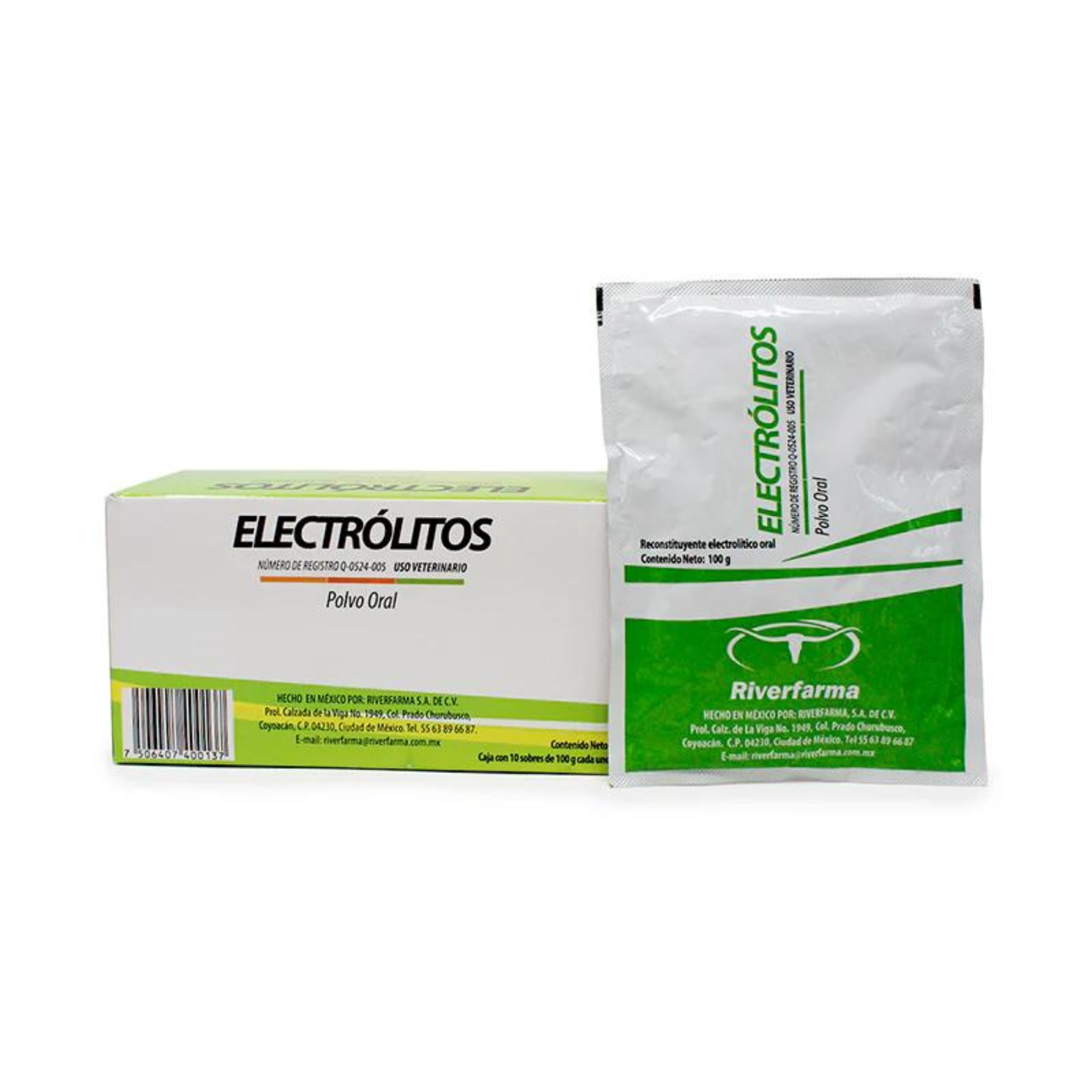 Electrólitos 10 Sobres de 100 g c/u es un reconstituyente electrolítico oral de Riverfarma, formulado con bicarbonato de sodio, cloruro de potasio, cloruro de sodio, dextrosa anhidra y sulfato de magnesio. Está indicado para todas las especies y se utiliza principalmente para la prevención y tratamiento de la deshidratación.