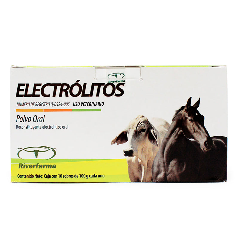 Electrólitos de Riverfarma es un reconstituyente electrolítico oral en polvo para todas las especies, indicado para la prevención y tratamiento de la deshidratación causada por diarrea severa, vómito y ejercicio fuerte.