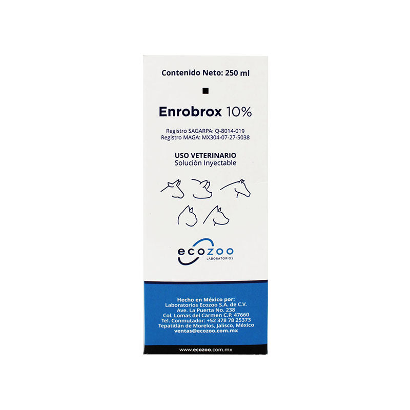 Enrobrox 10% es un antimicrobiano de amplio espectro con mucolítico-expectorante de EcoZoo, formulado con Enrofloxacina y Ambroxol HCl, indicado para el tratamiento de enfermedades respiratorias en bovinos.