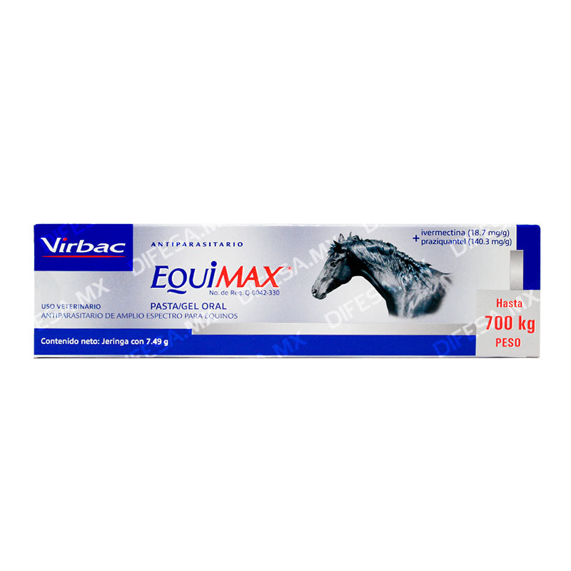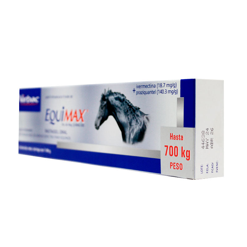 EQUIMAX® es un antiparasitario interno en pasta oral de Virbac para equinos, formulado con Ivermectina y Praziquantel para el control integral de parásitos internos.