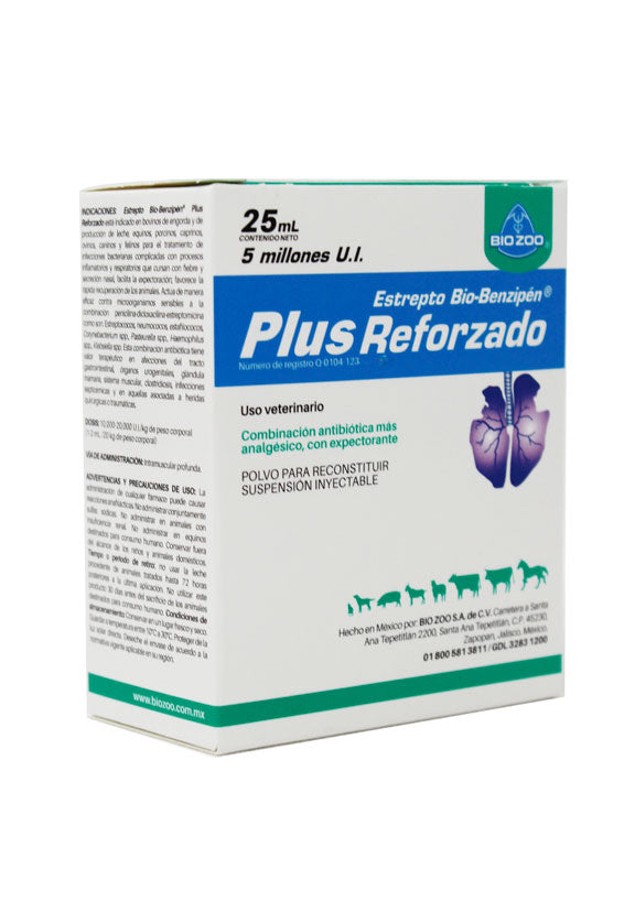 Estrepto Bio-Benzipén Plus Reforzado está indicado en bovinos de engorda y de producción de leche, equinos, porcinos, caprinos, ovinos, caninos y felinos para el tratamiento de infecciones bacterianas complicadas con procesos inflamatorios y respiratorios que cursan con fiebre y secreción nasal, facilita la expectoración; favorece la rápida recuperación de los animales. Actúa de manera eficaz contra microorganismos sensibles a la combinación penicilina-dicloxacilina-estreptomicina como son: Estreptococos, neumococos, estafilococos, Corynebacterium spp. Pasteurella spp. Haemophilus spp., Klebsiella spp. Esta combinación antibiótica tiene valor terapéutico en afecciones del tracto gastrointestinal, órganos urogenitales, glándula mamaria, sistema muscular, clostridiosis, infecciones septicémicas y en aquellas asociadas a heridas quirúrgicas o traumáticas.