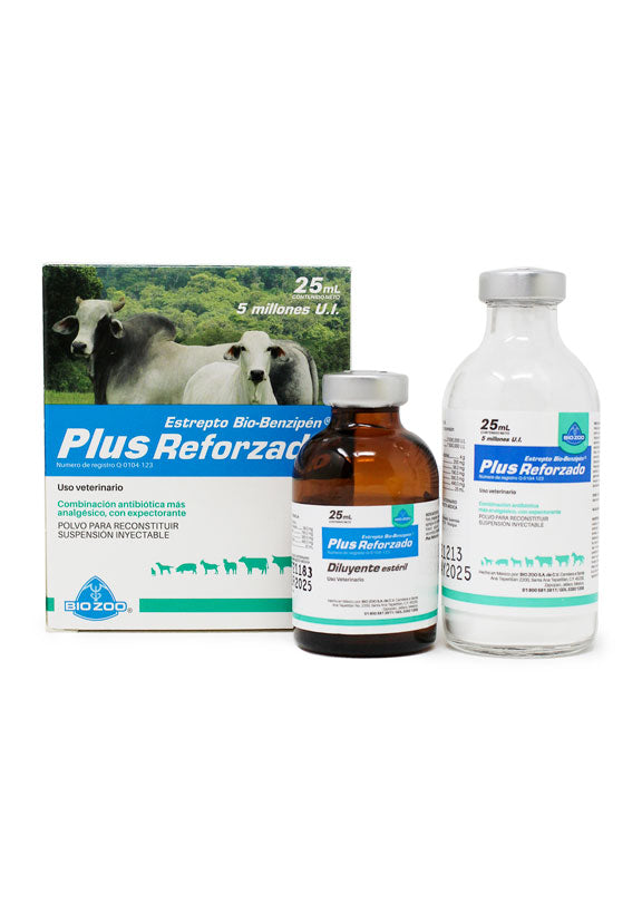 Estrepto Bio-Benzipén® Plus Reforzado de Biozoo es una combinación antibiótica con analgésico y expectorante para bovinos, indicada para el tratamiento de infecciones bacterianas complicadas con procesos inflamatorios y respiratorios.