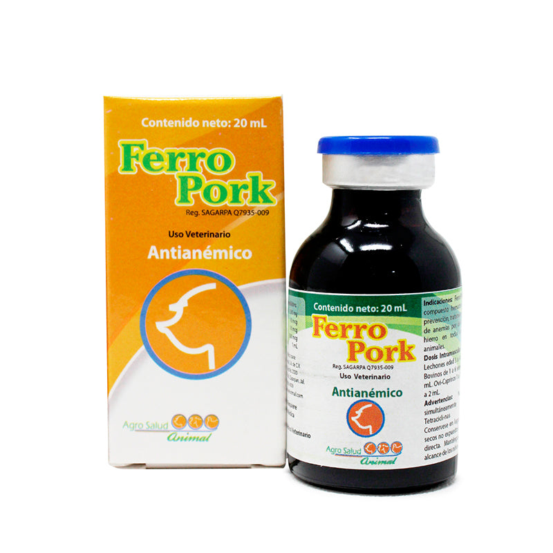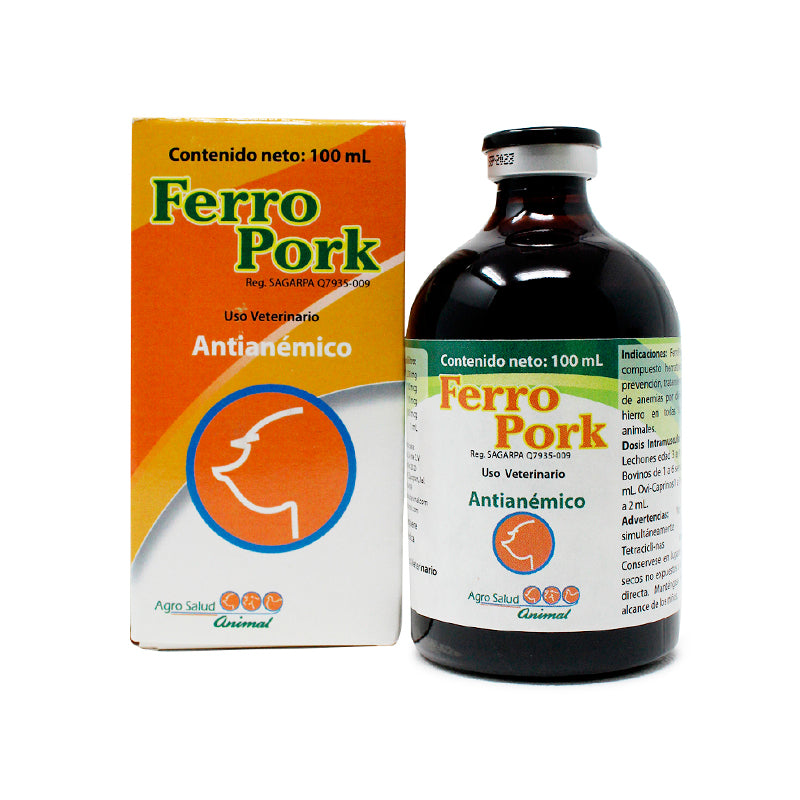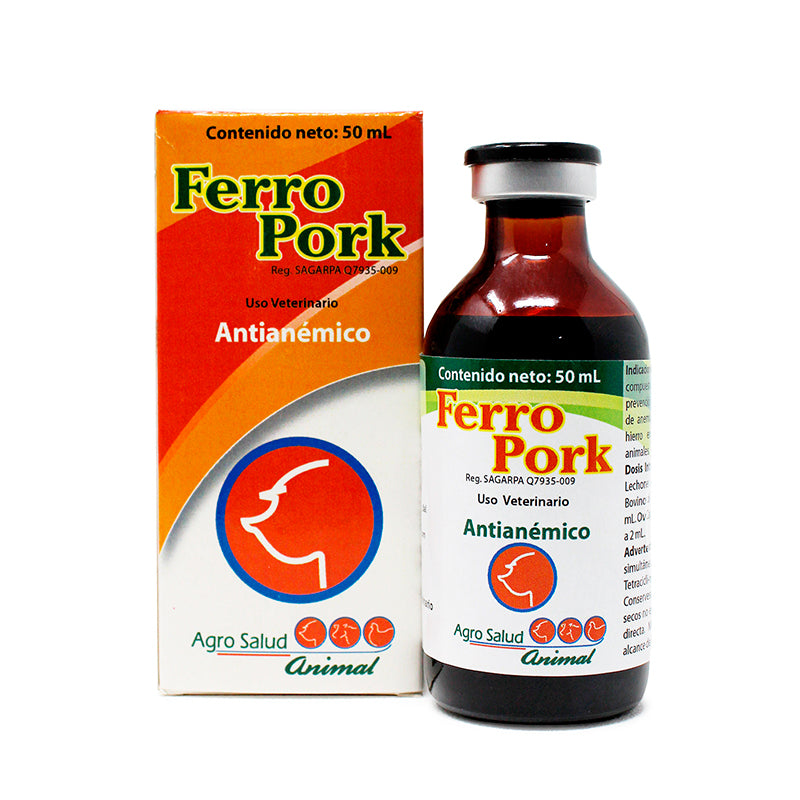 Ferro Pork es un antianémico y suplemento hematínico de Agrosalud, formulado con Hierro Dextrán, Vitamina B12, Cobalto y Zinc. Está indicado para todas las especies animales para la prevención, tratamiento y control de anemias por deficiencia de hierro.