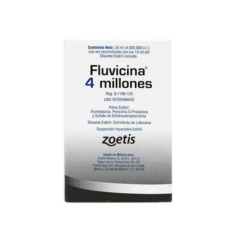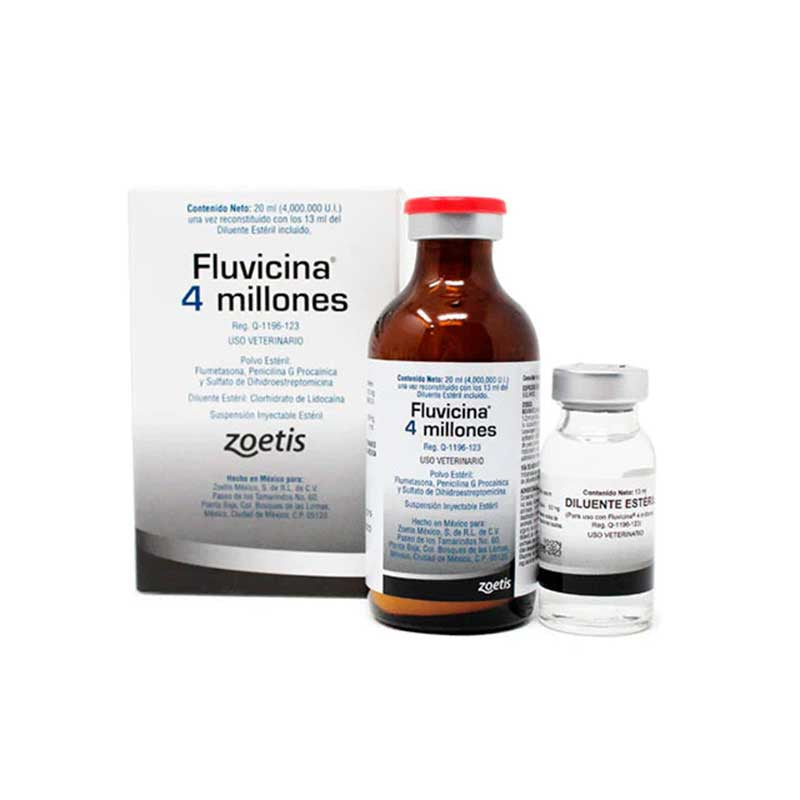 Fluvicina 4 Millones es un antibiótico de amplio espectro efectivo contra diversas infecciones bacterianas en bovinos. Es un producto de confianza del laboratorio Zoetis, diseñado específicamente para esta especie.