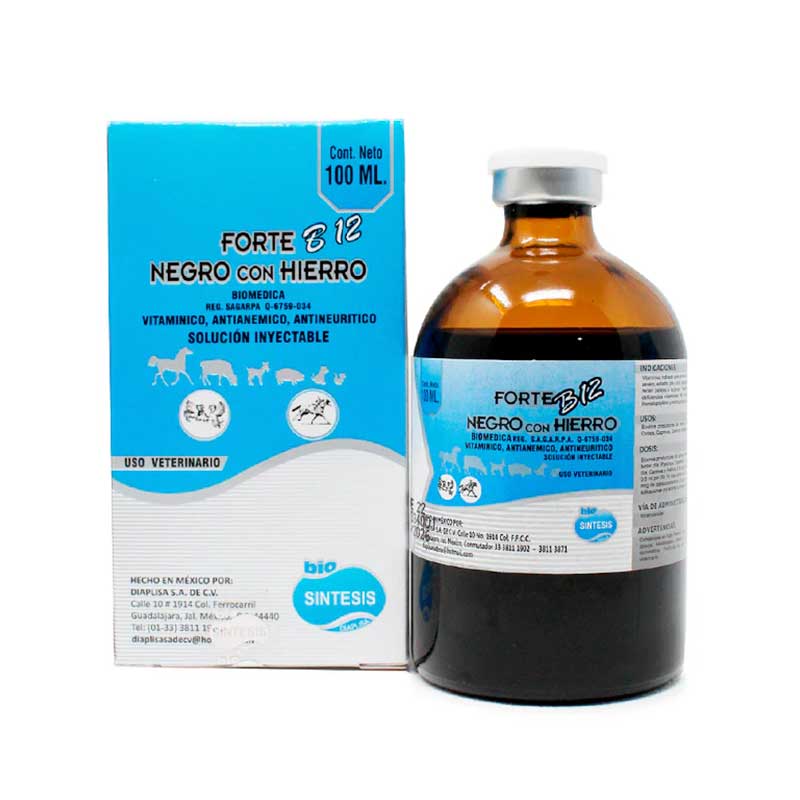 Forte B12 Negro con Hierro 100 ml es un complejo vitamínico y antianémico reconstituyente de Diaplisa, formulado con vitaminas del complejo B y hierro dextrán. Está indicado para todas las especies animales, principalmente para tratar anemia, agotamiento severo y estados de deficiencia vitamínica.