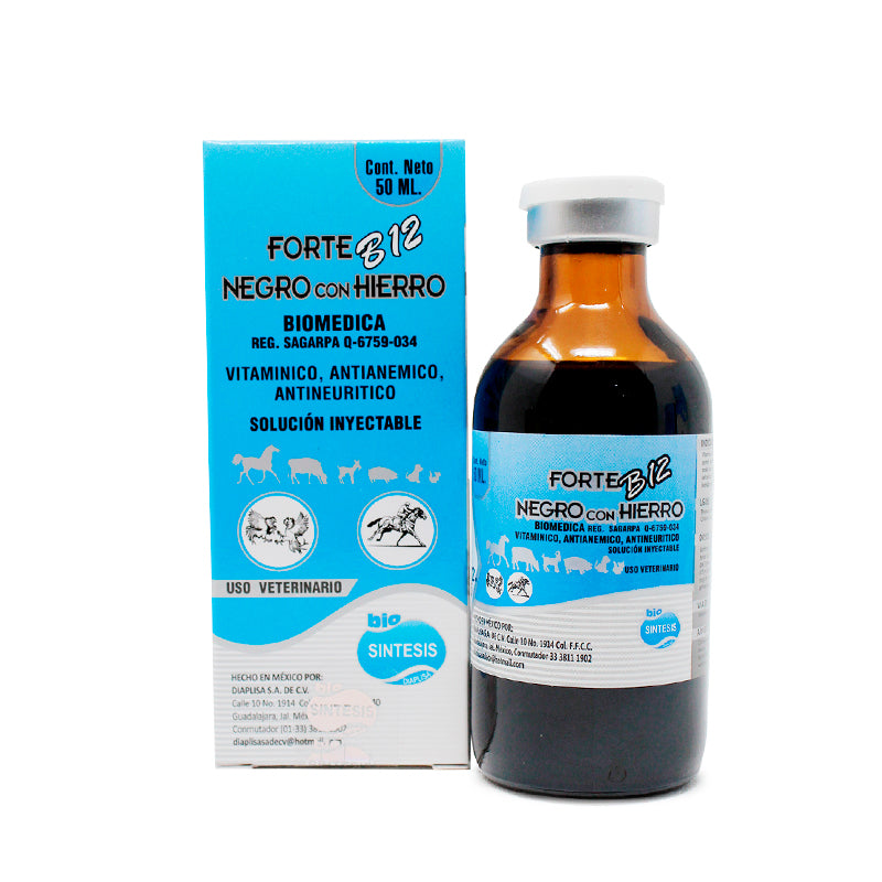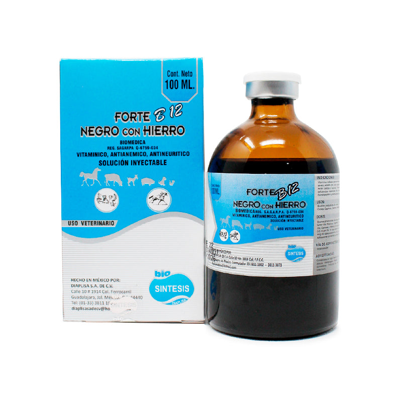FORTE B12 NEGRO CON HIERRO es un complejo vitamínico y antianémico reconstituyente de Diaplisa, formulado con Nicotinamida, Tiamina, Riboflavina, Piridoxina, Cianocobalamina (B12) y Hierro Dextrán. Está indicado para todas las especies animales y su uso principal es el tratamiento de la anemia, el agotamiento severo y la prevención de deficiencias del complejo B.
