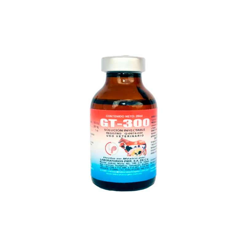 GT-300 20 ml es un antibiótico de amplio espectro fabricado por Laboratorios Pier, formulado específicamente para bovinos. Su composición está diseñada para el tratamiento de infecciones bacterianas comunes en el ganado.