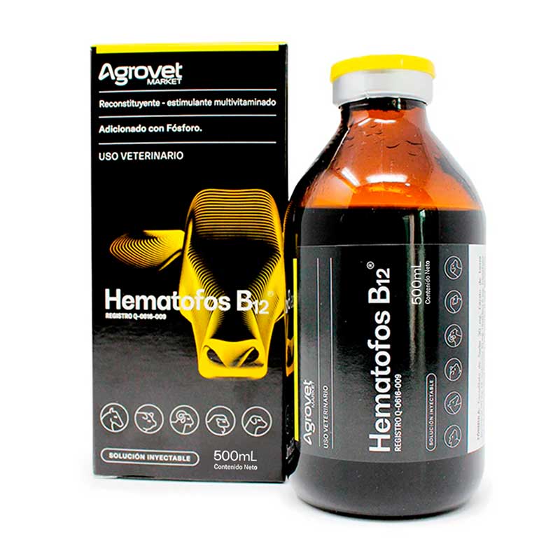 Hematofos B12 500 ml es un reconstituyente multivitaminado inyectable con fósforo y complejo hematínico de Agrovet Market, formulado para bovinos. Actúa como tónico general, estimulante del apetito y tratamiento para trastornos hematopoyéticos y metabólicos.
