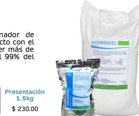 Copolímero no húmico sólido para acondicionador de suelo, compuesto de cristales finos, que, al contacto con el agua, se hincha formando un gel capaz de retener más de 300 veces su peso en agua. Permite entregar el 99% del agua a las plantas.