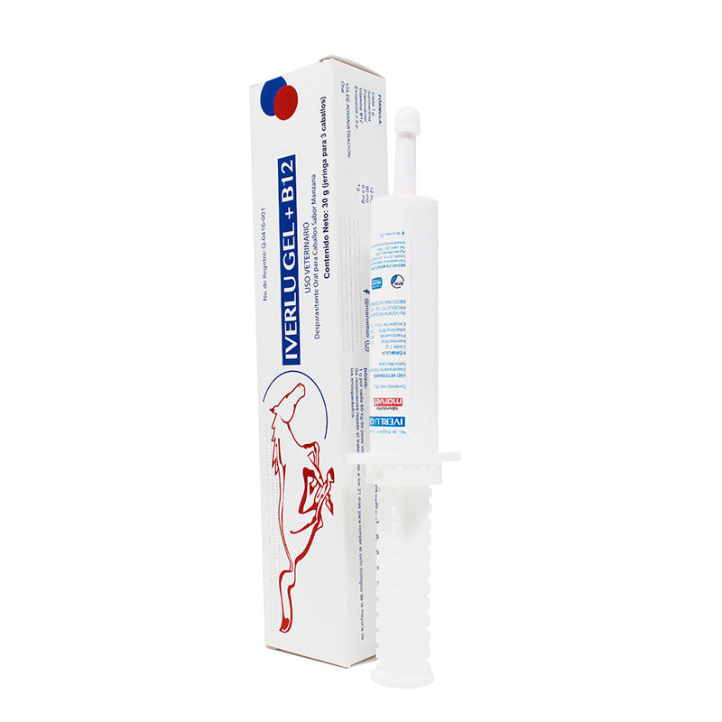 Iverlu Gel + B12 es un endectocida oral de amplio espectro indicado para el control y tratamiento de parásitos gastrointestinales en equinos, como Strongylus vulgaris, S. equinus, S. edentatus, Triodontophorus spp., Parascaris equorum y Probstymayria vivípara.