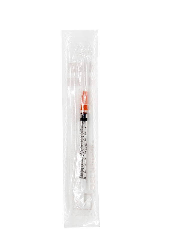 Jeringa de 1 ml estéril de plástico con aguja 25G x 16mm (0.50 mm x 5/8″). Jeringa de plástico, grado médico para tuberculina con aguja, estéril y desechable, capacidad de 1 ml, escala graduada en ml. Con divisiones de 0.05 ml y subdivisiones de 0.01 ml. Con aguja longitud 16mm, calibre 25G.