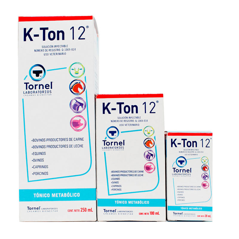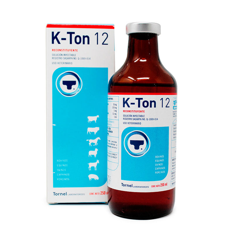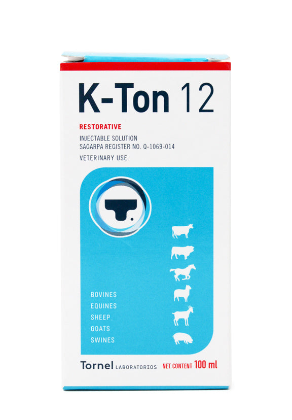 K-Ton 12® es un reconstituyente vitamínico y vigorizante de laboratorio Tornel para bovinos, formulado con Vitamina B12 (cianocobalamina) y Glicerofosfato de Sodio, indicado como reconstituyente post-parto y para estados de estrés.