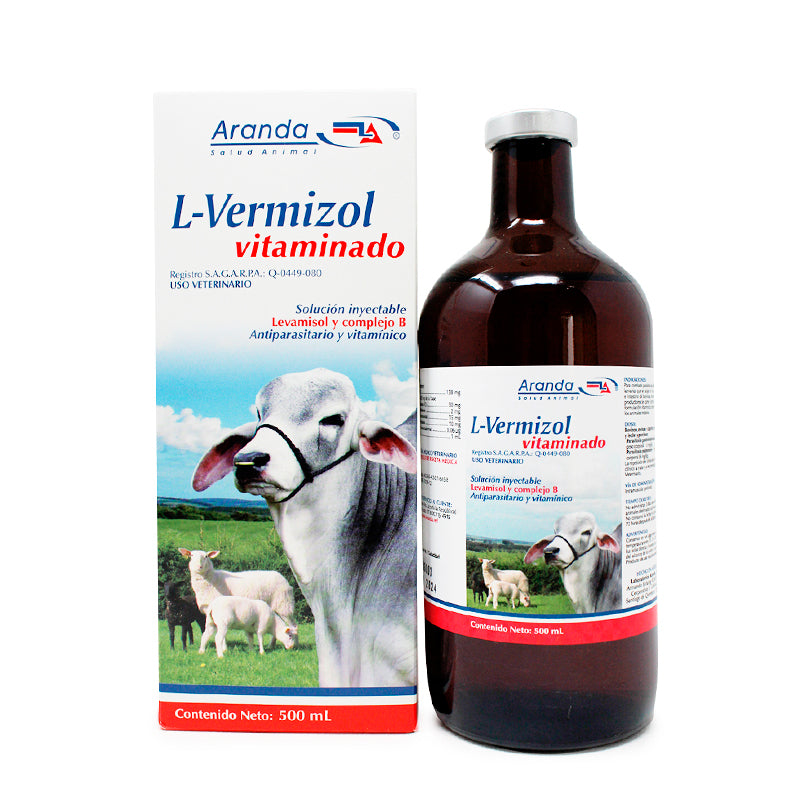 L-Vermizol Vitaminado es un antiparasitario y vitamínico de Laboratorio Aranda para bovinos, formulado con Levamisol y Complejo B para combatir parásitos internos y acelerar la recuperación de los animales.
