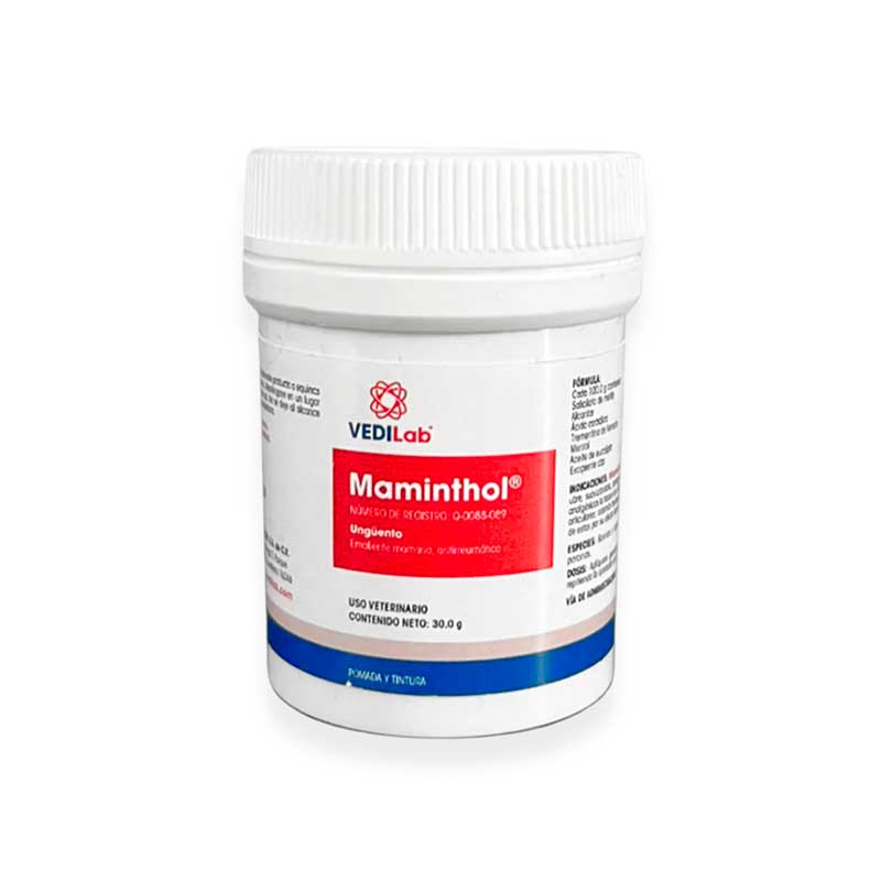 Maminthol 30 g es rubefaciente, emoliente, antirreumático, desinfectante y bactericida. Además, tiene propiedades analgésicas, hipertérmicas y cicatrizantes, siendo útil en procesos inflamatorios, reumáticos y traumáticos en animales domésticos.