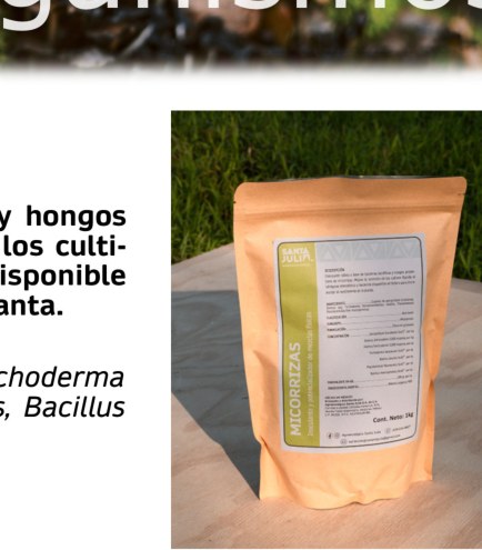 Inoculante solido a base de bacterias benéficas y hongos promotores de micorrizas. Mejora la nutrición de los cultivos fijando el nitrógeno atmosférico y haciendo disponible el fósforo para incrementar el rendimiento de la planta. Contenido: Esporas de azospirillum brasilense, Glomus spp, Trichoderma harzianum, Basilus sbutilis, Pseudomonas flourescens, Bacillus mucilaginosus.