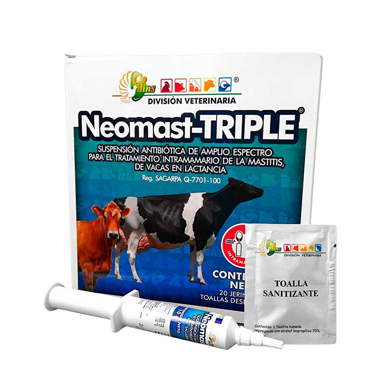 Neomast Triple 20 Jeringas de 10 g c/u es un antibiótico intramamario de amplio espectro, fabricado por Collins División Veterinaria, formulado específicamente para el tratamiento de mastitis en bovinos.