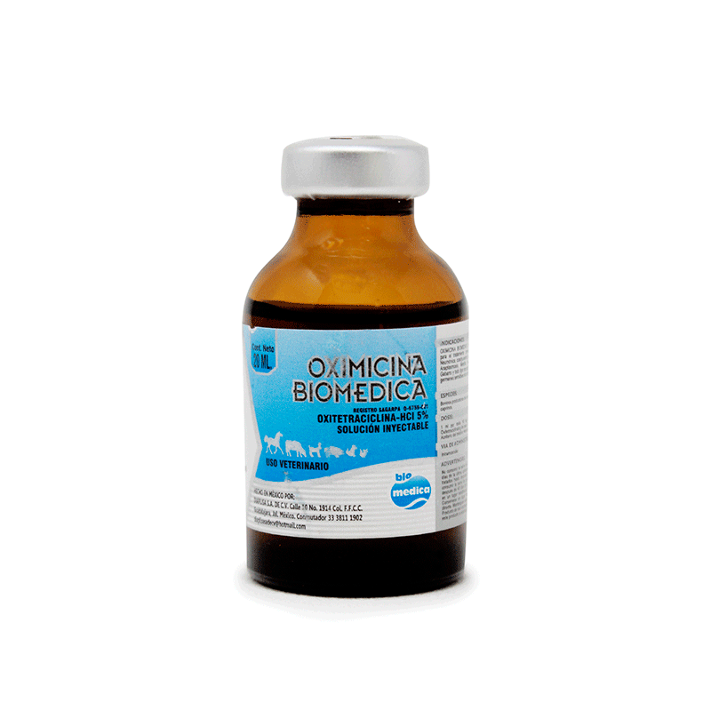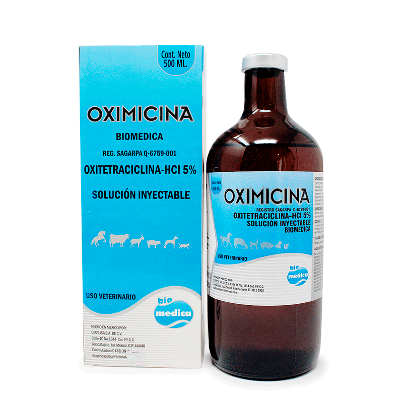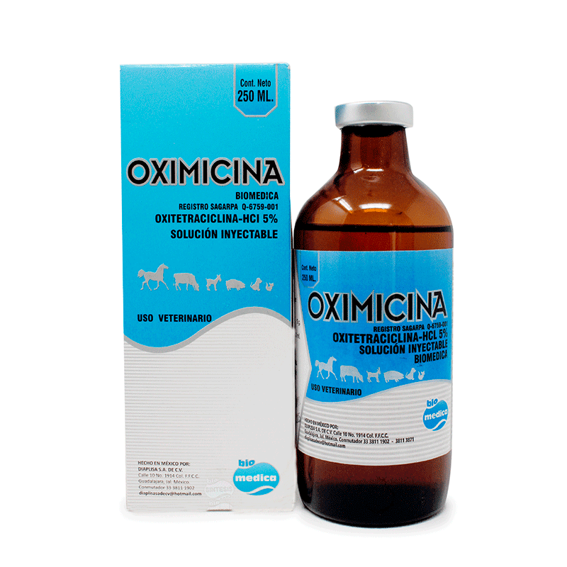 OXIMICINA BIOMEDICA. Solución de oxitetraciclina de alta concentración recomendada para el tratamiento, prevención y control de Pasteurelosis Neumónica, coadyuvante en el tratamiento de síndrome M.M.A., Anaplosmósis, Metritis, Neumonía Infecciosa, Pierna Negra, Gabarro y todo tipo de padecimientos infecciosos originados por gérmenes sensibles al antibiótico de la fórmula (Oxitetraciclina) en bovinos, equinos, porcinos, ovinos y caprinos.