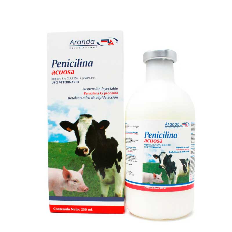 Penicilina Acuosa 250 ml sirve para el tratamiento y control de infecciones en bovinos causadas por bacterias susceptibles a la penicilina, como Streptococcus spp., Staphylococcus aureus, Corynebacterium pyogenes y Pasteurella sp. Es un antibiótico betalactámico de rápida acción formulado con Penicilina G Procaína.