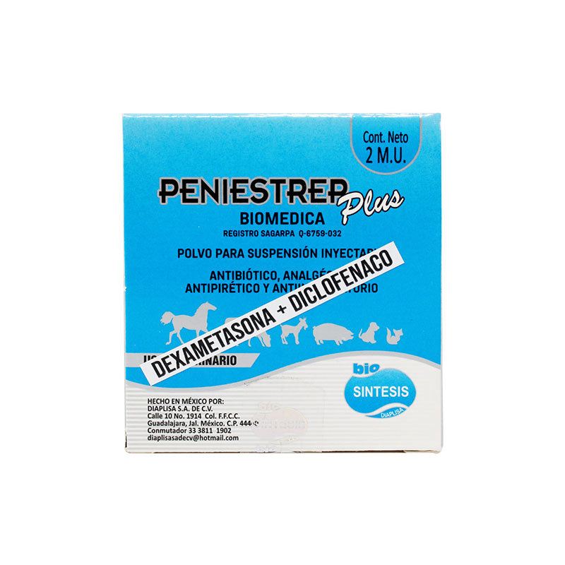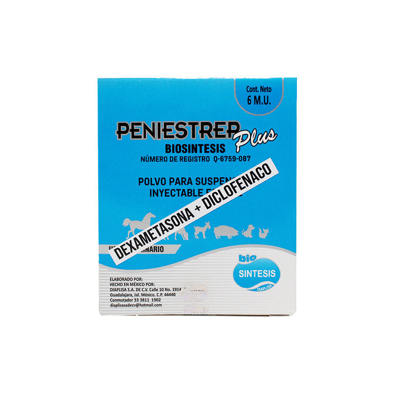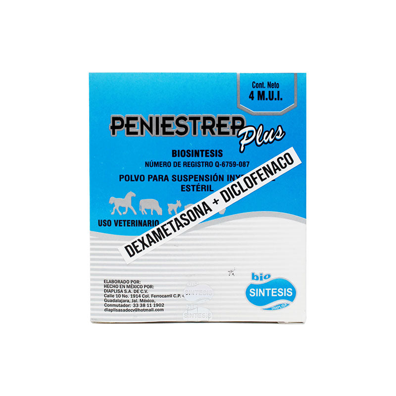 Peniestrep Plus es un producto veterinario del laboratorio Diaplisa, formulado como una combinación de antibióticos (Penicilina G Benzatina, Penicilina G Procaína, Estreptomicina, Dicloxacilina) y antiinflamatorios (Dexametasona, Diclofenaco). Está indicado para el tratamiento de infecciones bacterianas en bovinos, tanto productores de carne como de leche.