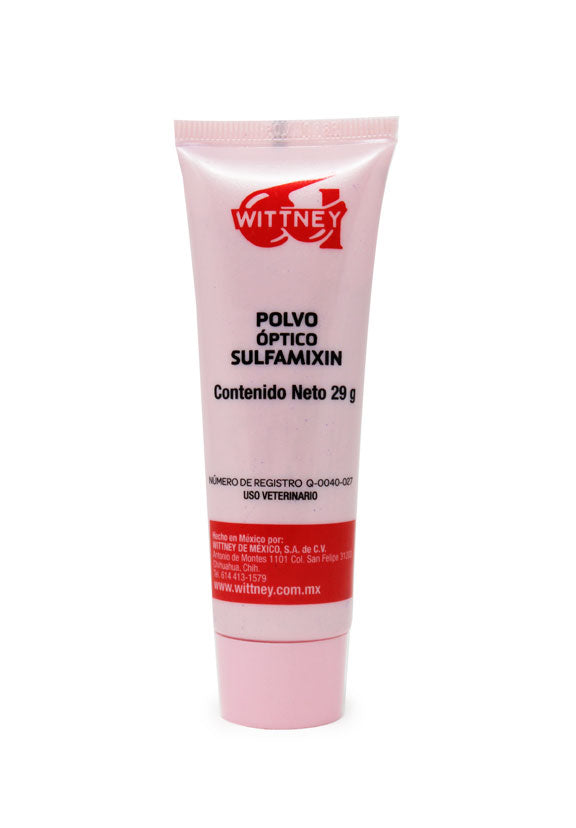 Polvo Óptico Sulfamixin de Wittney es un polvo oftálmico antibacteriano y cicatrizante formulado con Oxitetraciclina HCI, Sulfacetamida y Sulfatiazol sódico, indicado para el tratamiento de infecciones oculares y heridas superficiales en bovinos.