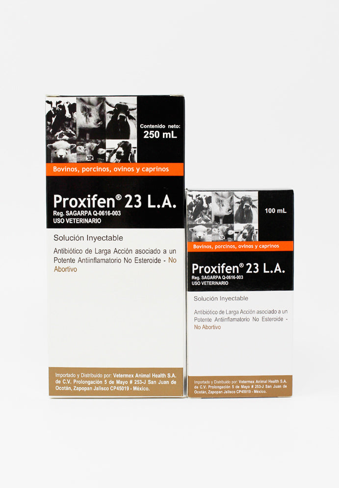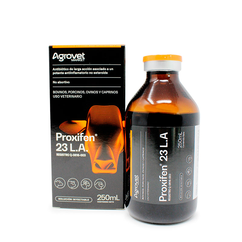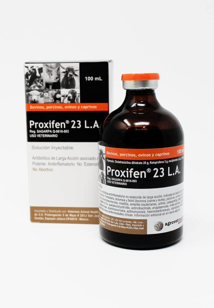 Proxifen® 23 L.A. de Agrovet Market es un antibiótico de larga acción que combina oxitetraciclina y ketoprofeno, un antiinflamatorio no esteroide de última generación. Está indicado para bovinos en el tratamiento de procesos infecciosos con reacción inflamatoria, dolorosa y febril.