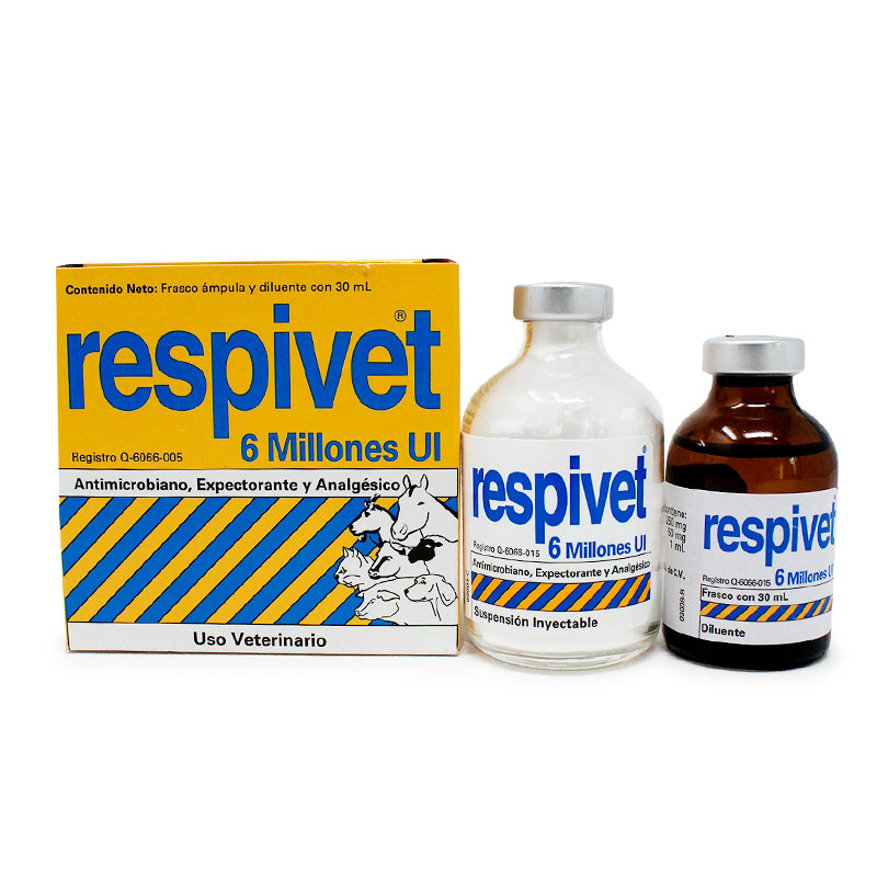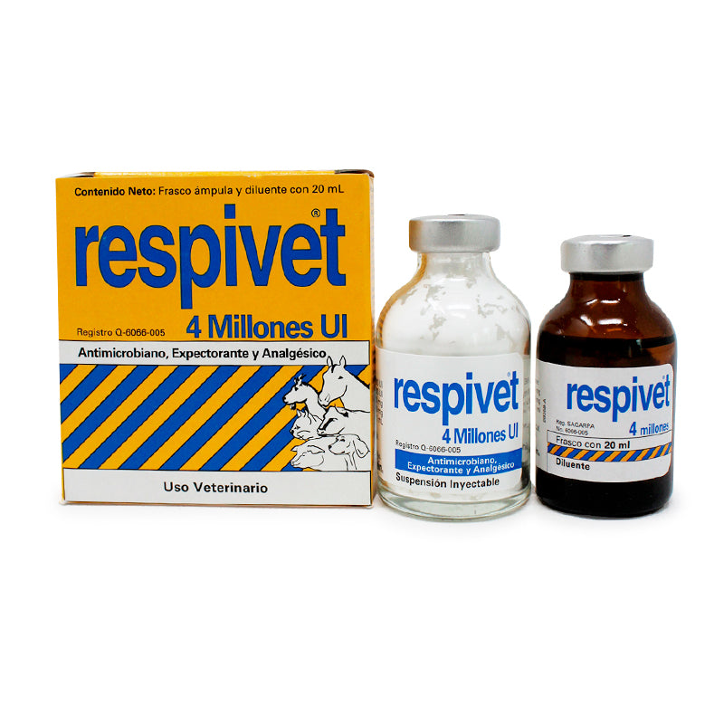 Para Respivet 2 Millones y 4 Millones: Bovinos productores de carne y de leche: 1 mL/25 kg de Peso Vivo. Tratamiento: 3 o 4 aplicaciones, una cada 12 horas. Para Respivet 6 Millones: Bovinos productores de leche y de carne: 2 mL/50 kg de peso corporal. Tratamiento: 1 aplicación cada 24 horas de 5 a 7 días. Vía de administración: Intramuscular profunda.