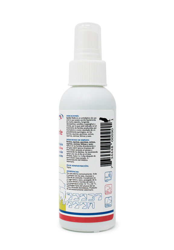 Sanitor Forte sirve como antiséptico de uso externo para el tratamiento de heridas por traumatismos o quirúrgicas en bovinos, equinos, porcinos, ovinos, caprinos, caninos, felinos y aves. Posee acción bactericida de amplio espectro, fungicida y viricida, lo que lo hace efectivo contra bacterias, hongos y virus.