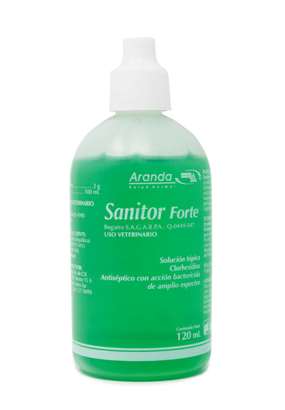 Sanitor Forte Gotero es un antiséptico tópico de amplio espectro con Clorhexidina, elaborado por el laboratorio Aranda. Está indicado para uso externo en todas las especies, principalmente para el tratamiento de heridas por traumatismo o quirúrgicas.