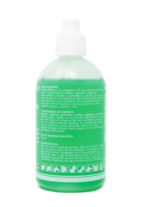 Sanitor Forte es un antiséptico de uso externo que posee acción antibactericida de amplio espectro, fungicida (dermatofitos, candida y aspergilus) y viricida, por lo que está indicado en el tratamiento de heridas producidas por traumatismo o como resultado de un procedimiento quirúrgico, en los bovinos, equinos, porcinos, ovinos, caprinos, caninos, felinos y aves.