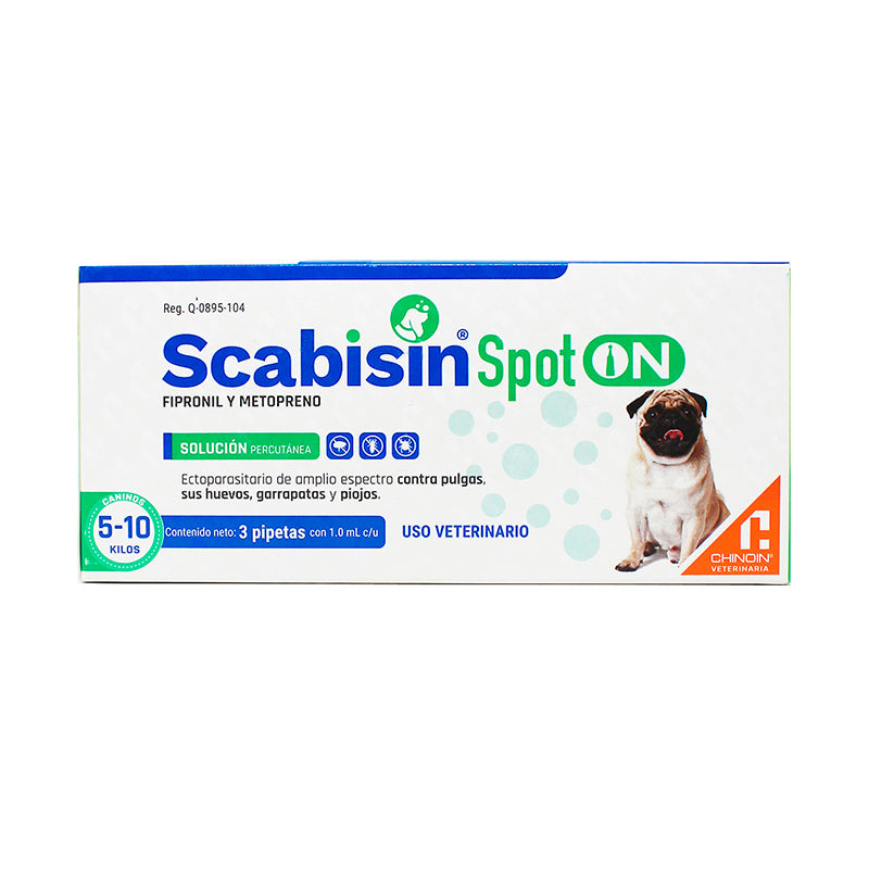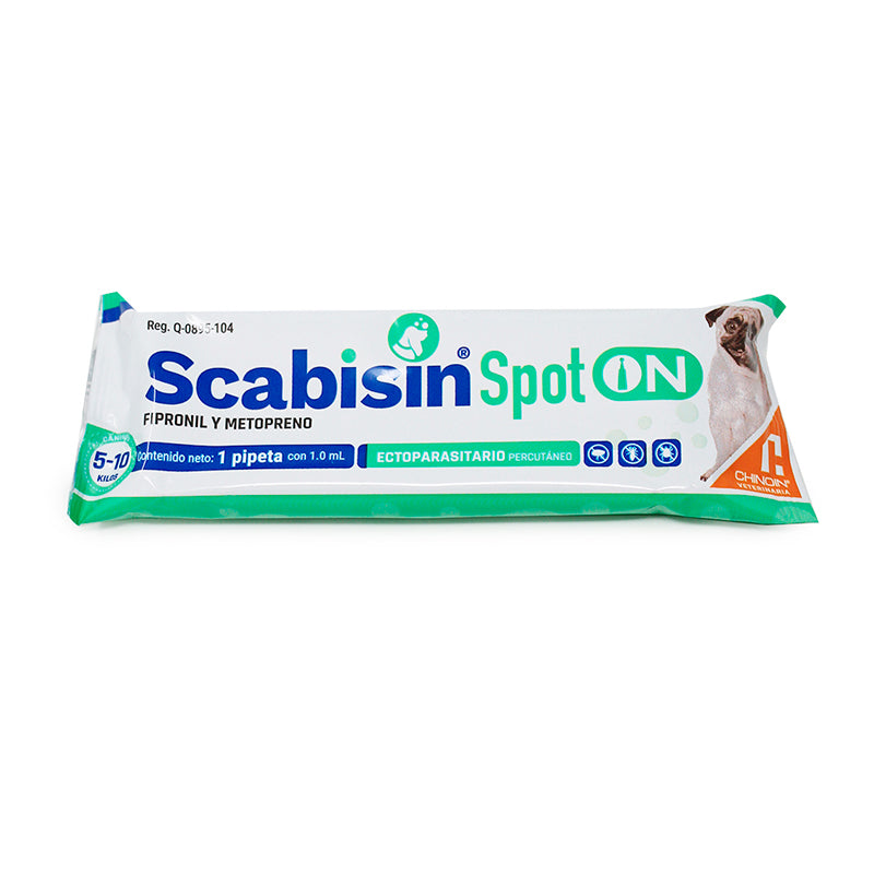 Scabisin® Spot On de 5 a 10 kg es un ectoparasiticida de amplio espectro de laboratorio Chinoin, formulado con Fipronil y Metopreno, para el tratamiento de infestaciones por pulgas, garrapatas y piojos en perros desde las 8 semanas de vida.