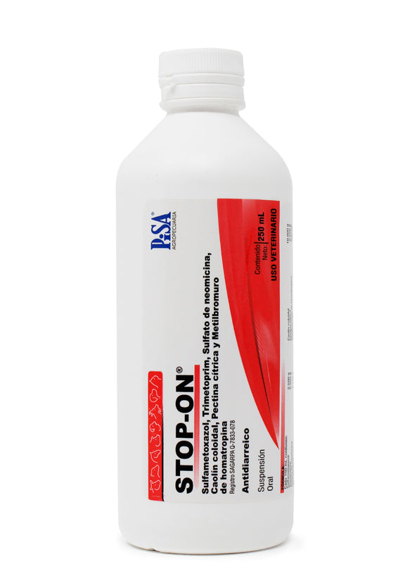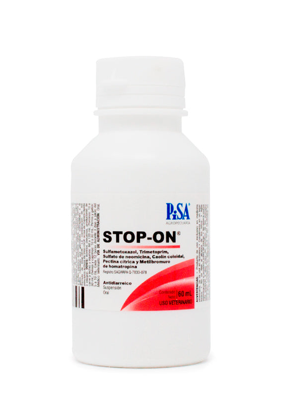 Stop-On® es un antidiarreico suspensión oral de Pisa, formulado con Sulfametoxazol, Trimetoprim, Sulfato de neomicina, Caolín coloidal, Pectina cítrica y Metilbromuro de homatropina. Está indicado para el tratamiento de diarreas infecciosas agudas y subagudas en bovinos.
