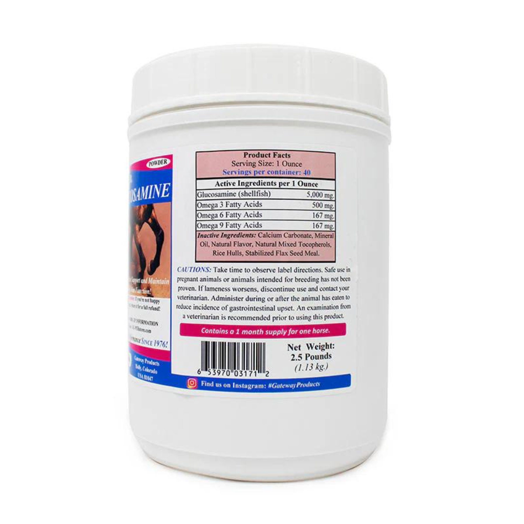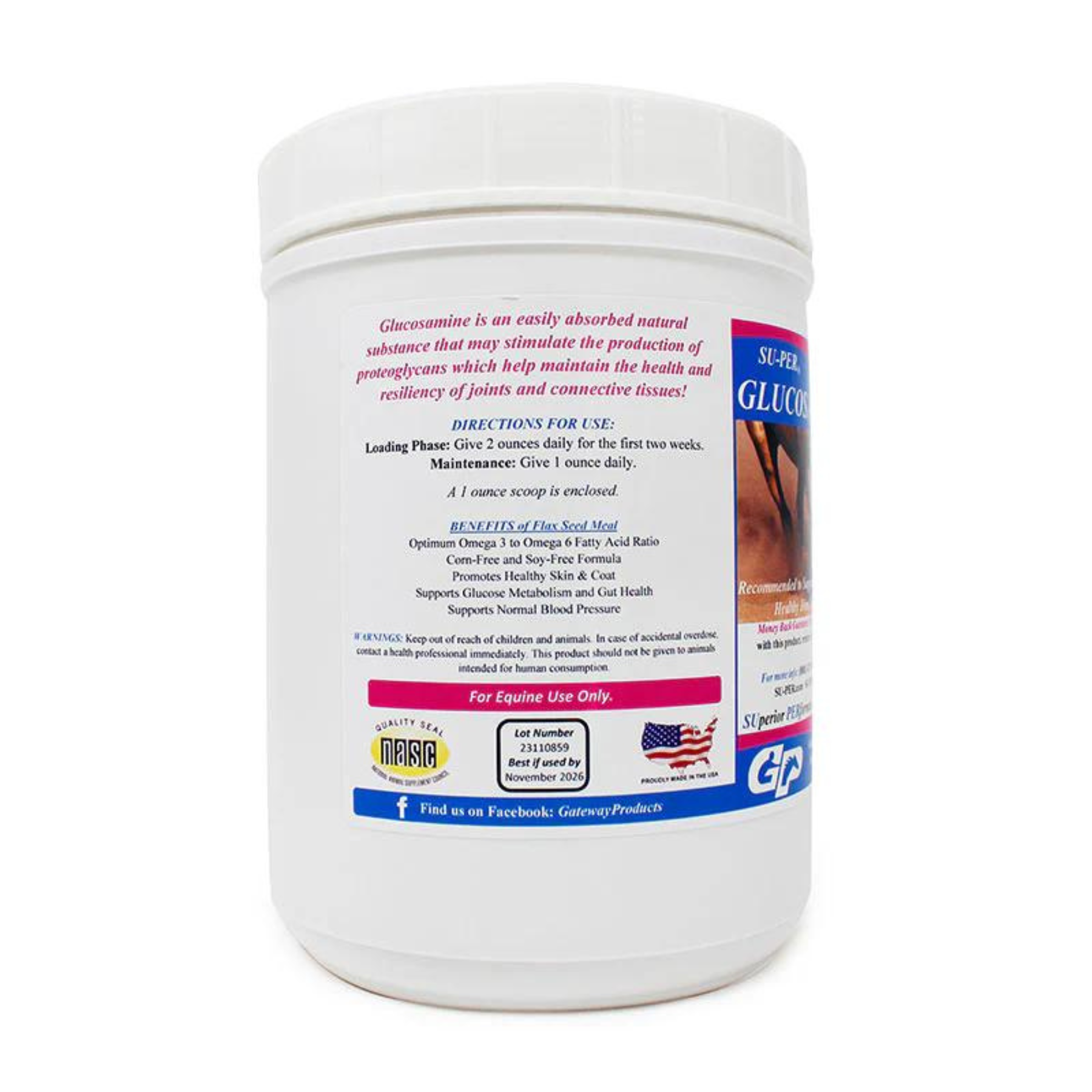 Su-Per Glucosamine 1.13 kg es un suplemento nutricional en polvo de Gateway Products, formulado con glucosamina y ácidos grasos omega, diseñado para uso equino con el fin de apoyar y mantener una función articular saludable.