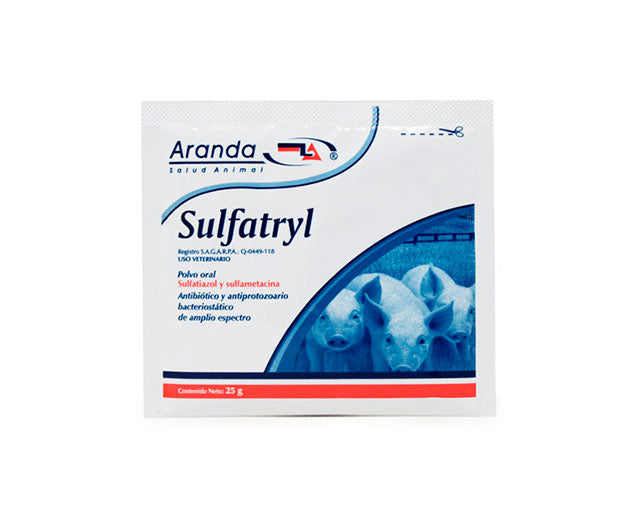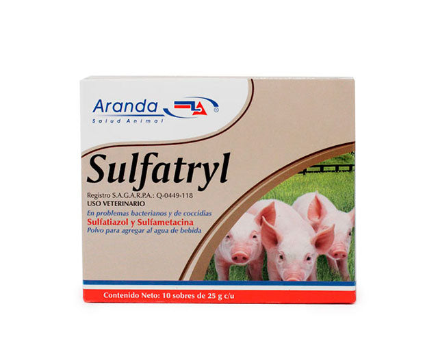 Sulfatryl® es un antibiótico sulfonamida del laboratorio Aranda, formulado con Sulfatiazol y Sulfametacina para aves. Su uso principal es el tratamiento de coccidiosis e infecciones bacterianas, administrado vía oral mezclado en el agua de bebida.