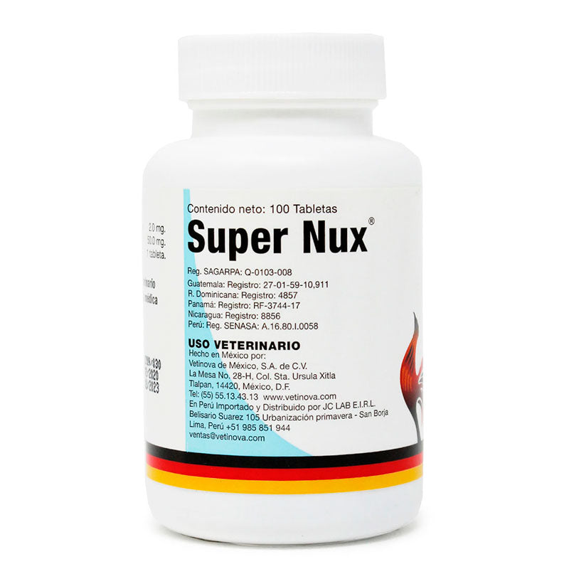 Super Nux® es un oxigenador y estimulante metabólico de Vetinova para aves, formulado con Extracto seco de Nuez Vómica y Carnitina. Está indicado como estimulante de la oxigenación de los tejidos y del metabolismo celular, eliminando toxinas y reduciendo la fatiga y el estrés en aves de combate.